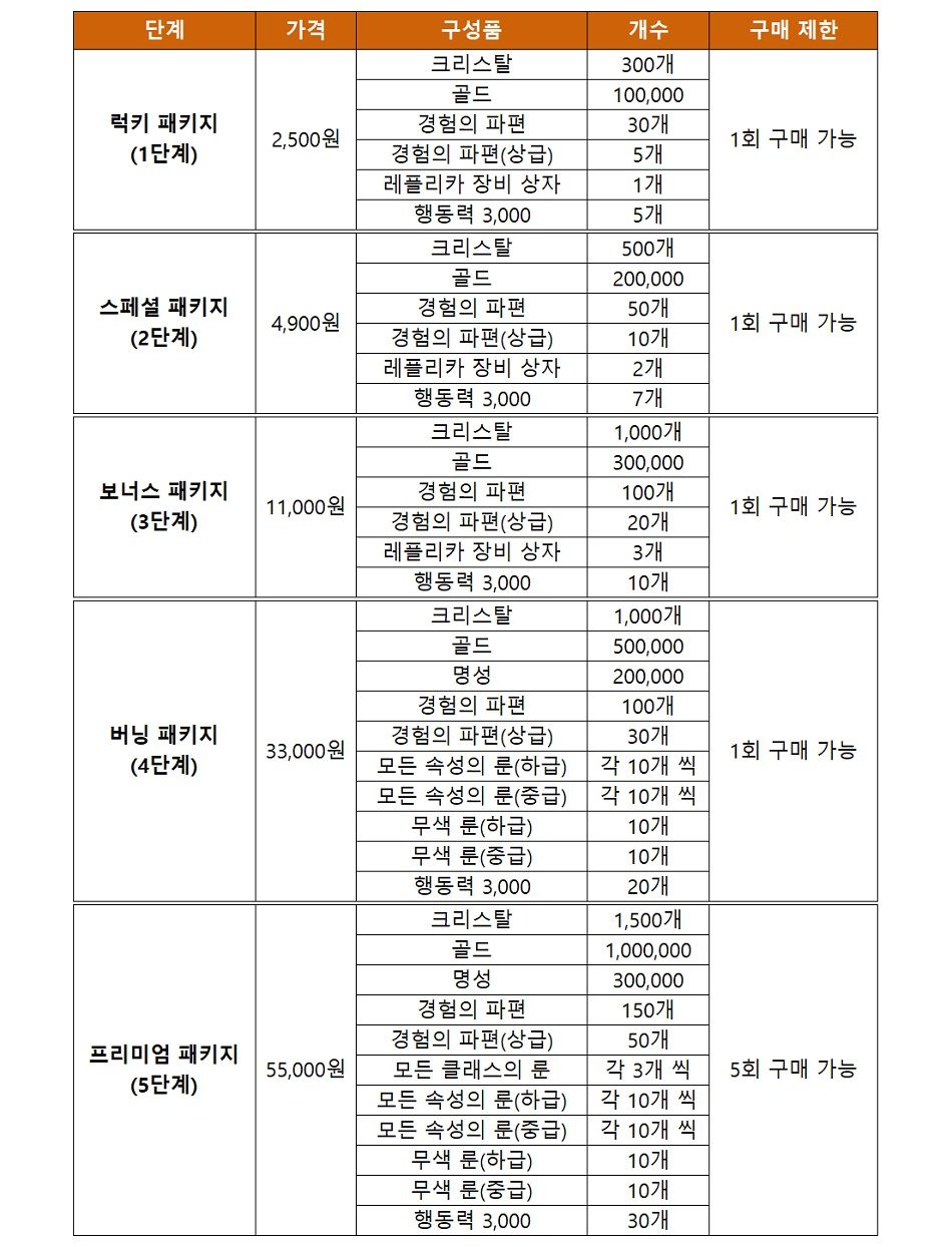 * 해당 패키지는 1~5단계로 이루어져 있으며, 이전 단계 패키지를 구매하면 다음 단계 패키지가 제시됩니다. (예 : 2단계 구매 → 3단계 구매 가능)