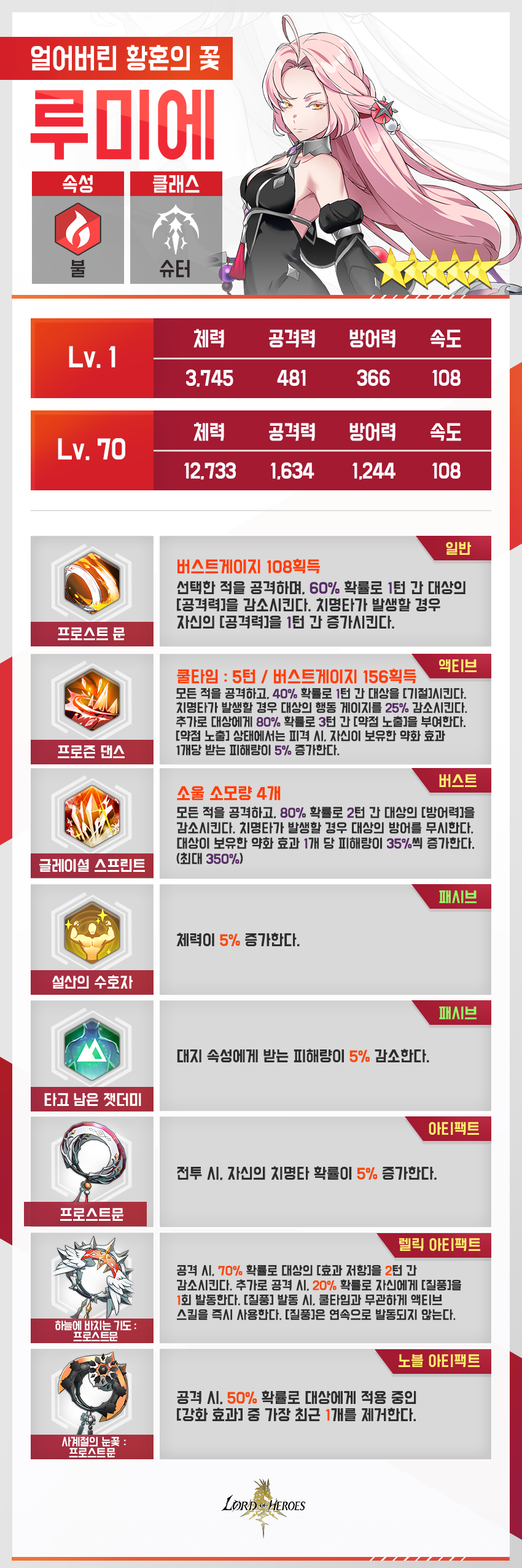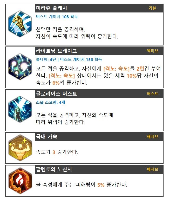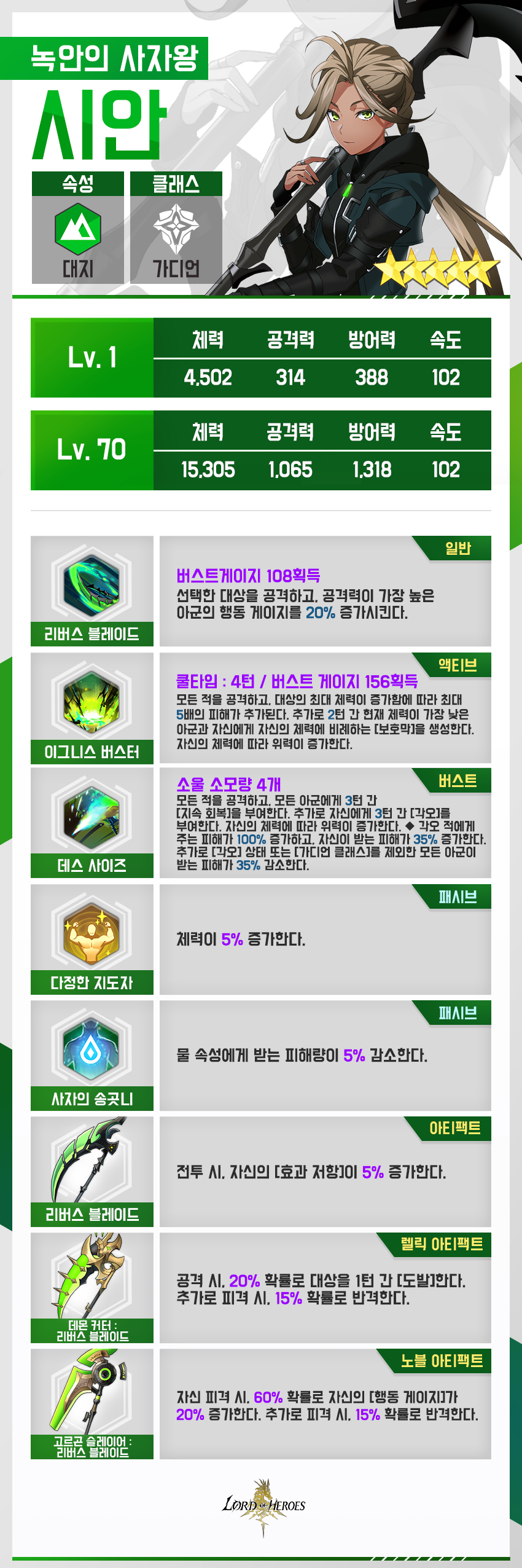 ◆ 기본 스탯 : 체력 4,502 / 공격력 314 / 방어력 388 / 속도 102