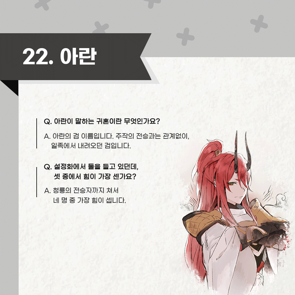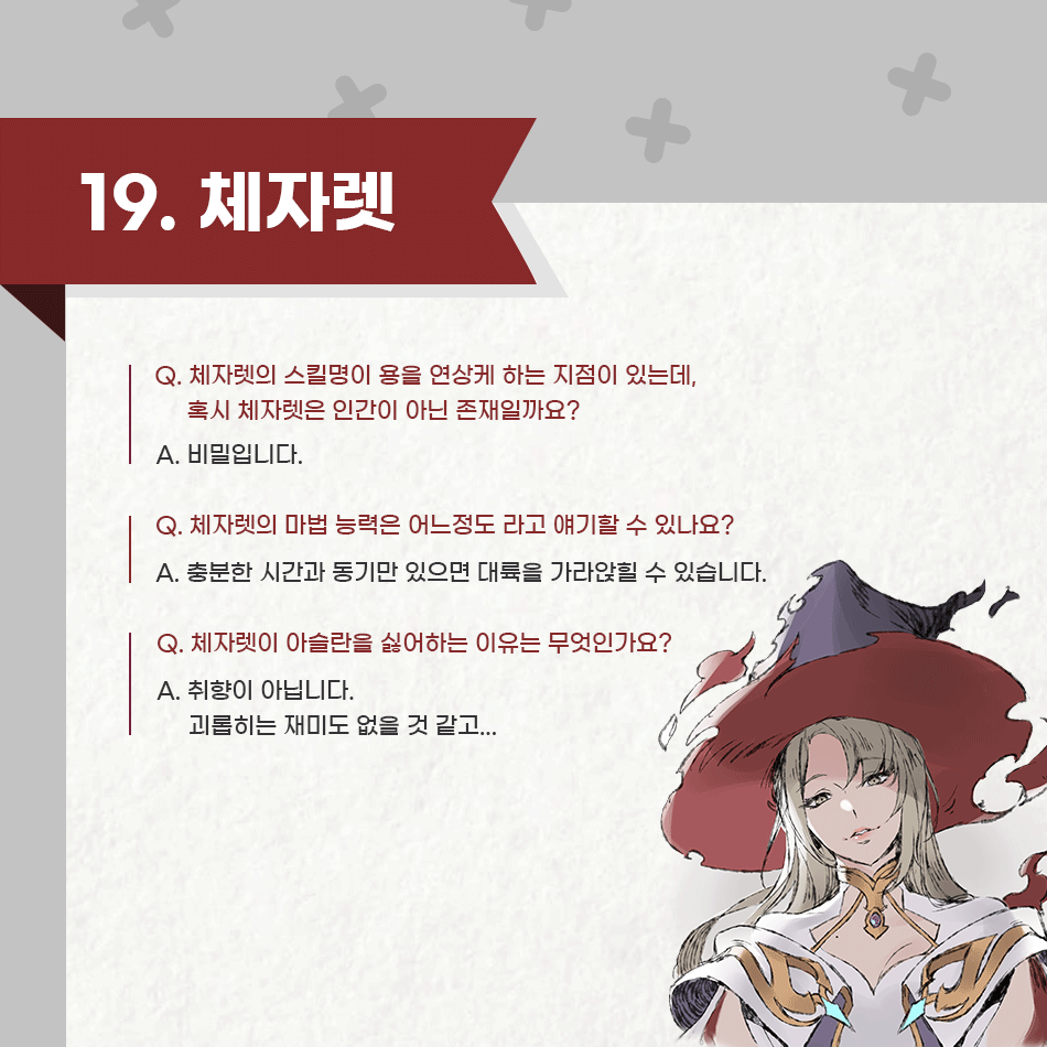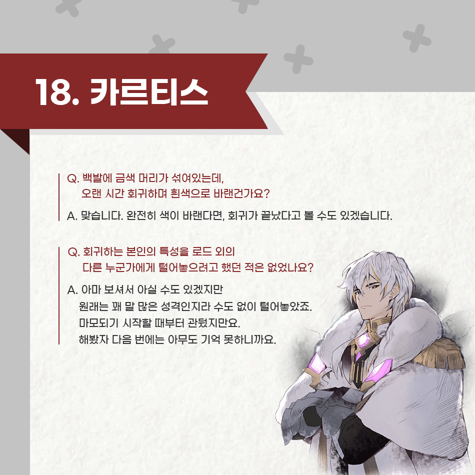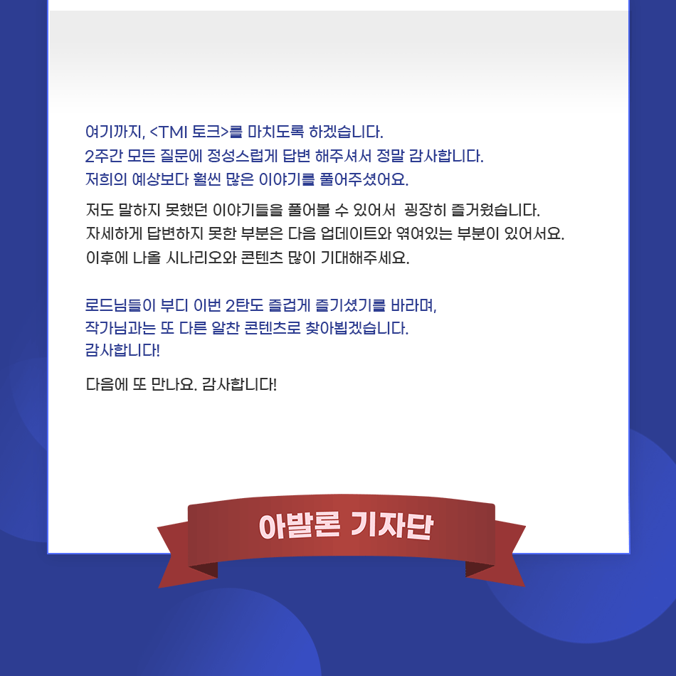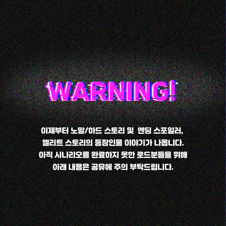 <TMI 토크> 2탄은 시나리오 후반에 등장하는 캐릭터, 그리고 엘리트 스토리만 등장하는 캐릭터들의 이야기가 나옵니다. 노말/하드 스토리의 스포일러, 엘리트 등장 캐릭터들이 다수 있을 수 있으니 이 점 유의해서 감상 부탁드립니다. 덧붙여, 아발론 기자단의 콘텐츠는 자유롭게 공유하셔도 되지만, 이번 콘텐츠의 경우 스토리를 확인하지 못한 로드분들이 계실 수 있으니, 특정 카드 뉴스의 내용에 대해서는 공유에 주의해주시면 감사드리겠습니다.