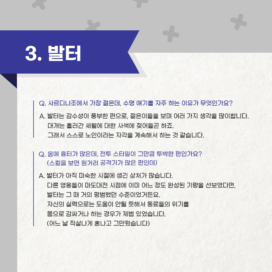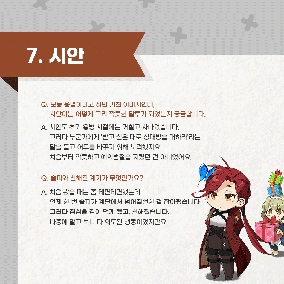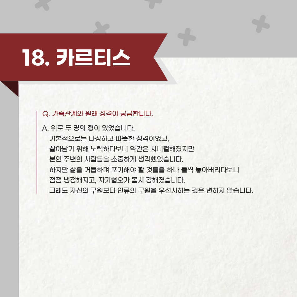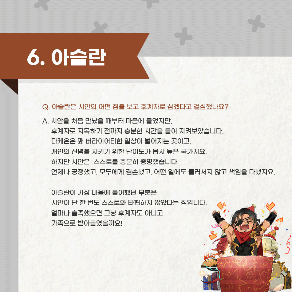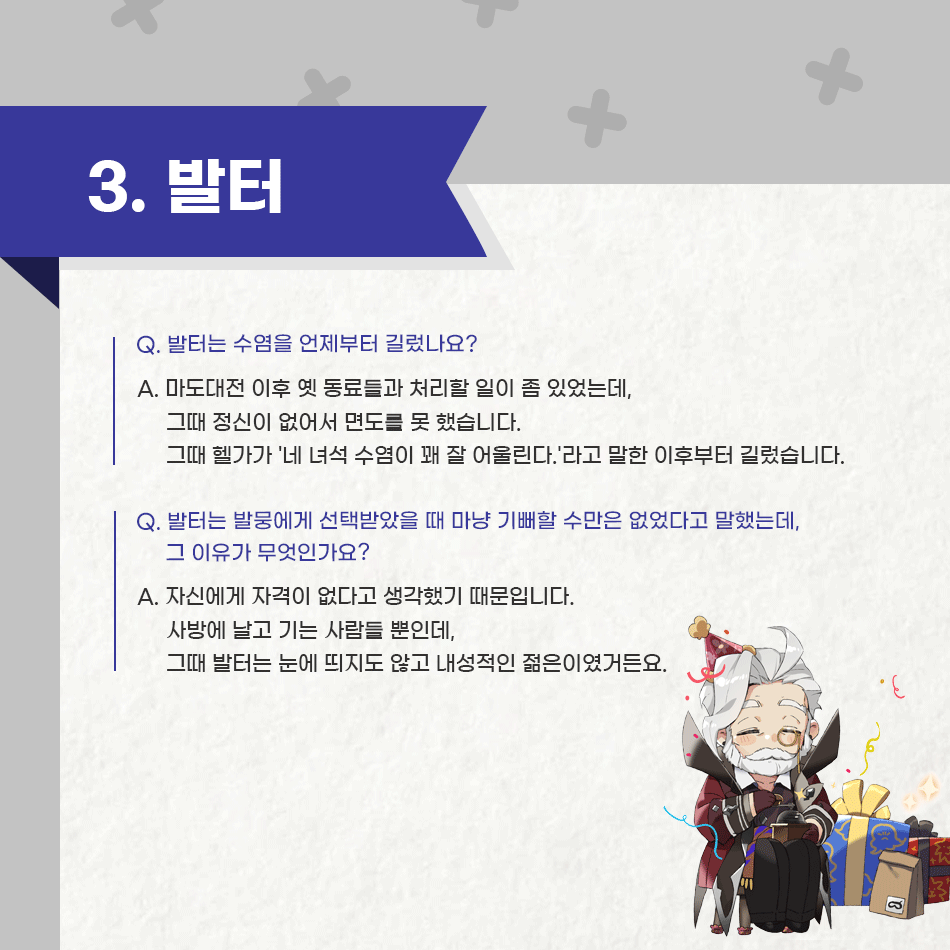 <TMI 토크> 2탄은 시나리오 후반에 등장하는 캐릭터, 그리고 엘리트 스토리만 등장하는 캐릭터들의 이야기가 나옵니다. 노말/하드 스토리의 스포일러, 엘리트 등장 캐릭터들이 다수 있을 수 있으니 이 점 유의해서 감상 부탁드립니다. 덧붙여, 아발론 기자단의 콘텐츠는 자유롭게 공유하셔도 되지만, 이번 콘텐츠의 경우 스토리를 확인하지 못한 로드분들이 계실 수 있으니, 특정 카드 뉴스의 내용에 대해서는 공유에 주의해주시면 감사드리겠습니다.