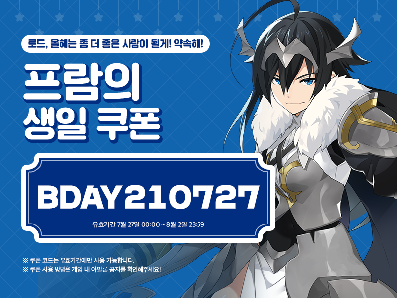 아발론에서 7월 27일부터 7월 28일까지 프람의 생일을 맞아 전용 장비 연성과 경험치 이벤트가 진행될 예정이니 프람의 생일을 축하해 주세요!