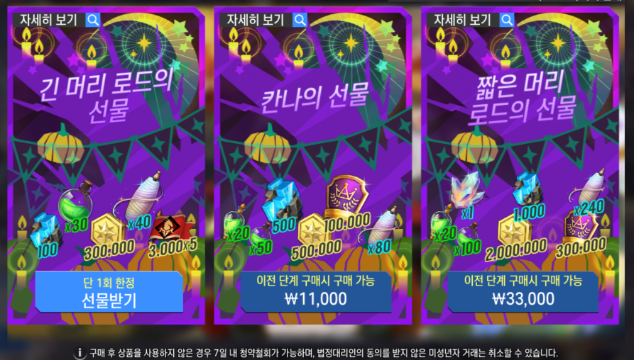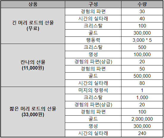 - 상품: 영웅 선물 패키지