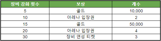 - 장비 강화 횟수에 따라 보상을 드립니다! 장비도 강화하고 보상도 챙겨가세요!