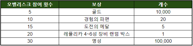 - 이벤트 기간 동안 오벨리스크 플레이 횟수에 따라 보상을 드립니다!