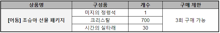 - 신규 영웅 패키지 [어둠] 조슈아 영입 후 구매할 수 있는 상품입니다.