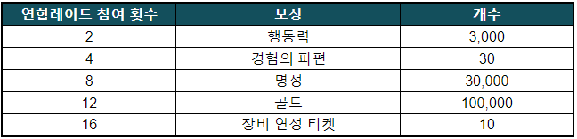 - 이벤트 기간 동안 연합 레이드 진행 횟수에 따라 보상을 드립니다!