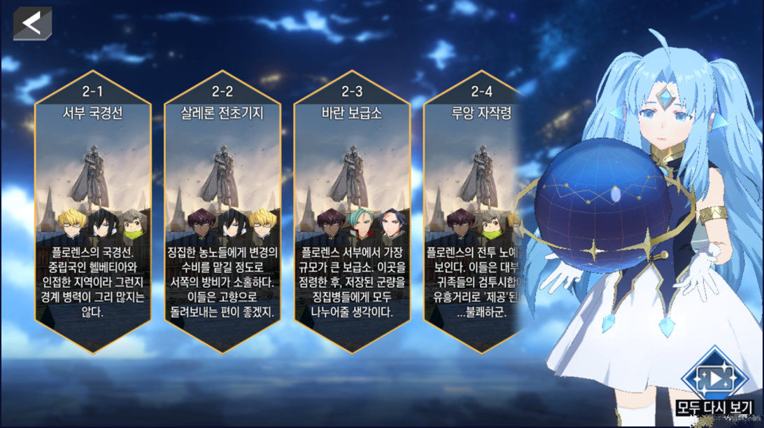 - [시나리오 > 모두 다시 보기]를 통해 챕터의 첫 번째 스토리부터 연속으로 감상할 수 있습니다.