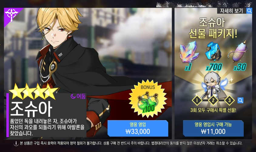 - [어둠] 조슈아는 신규 영웅 패키지 구매로 영입이 가능합니다.