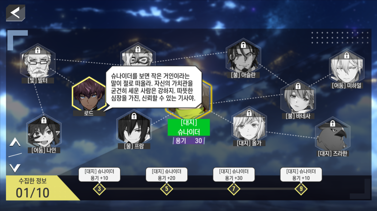 - [외전]에선 시나리오 외 스토리를 각 콘텐츠에서 한 번 이상 본 적이 있을 때에 오픈됩니다.
