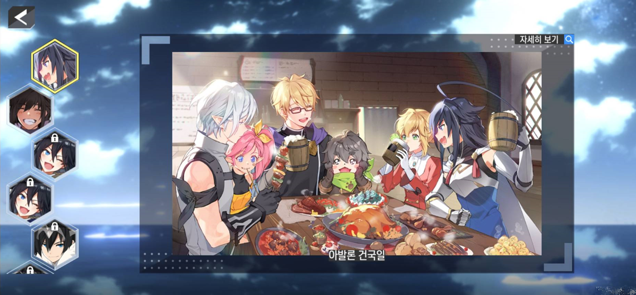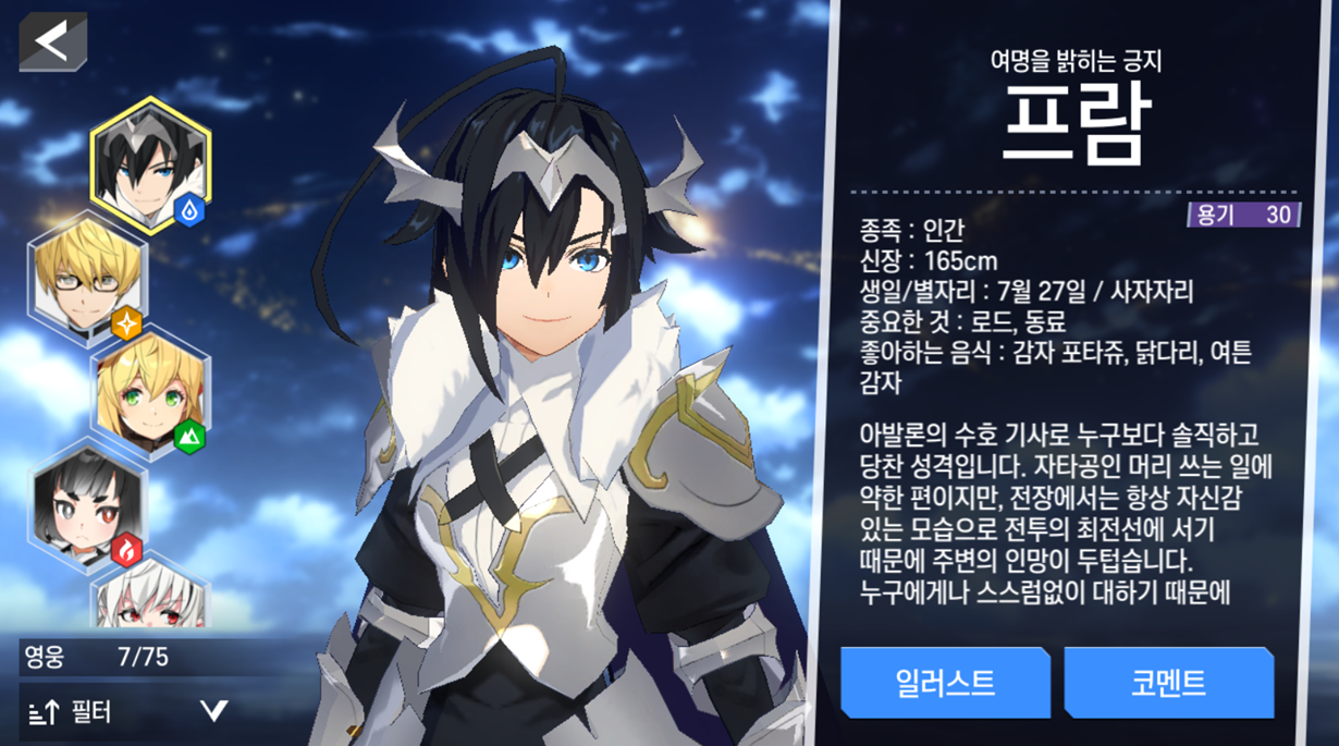 - [영웅 > 일러스트]에서 영웅들의 다양한 일러스트를 감상할 수 있습니다.