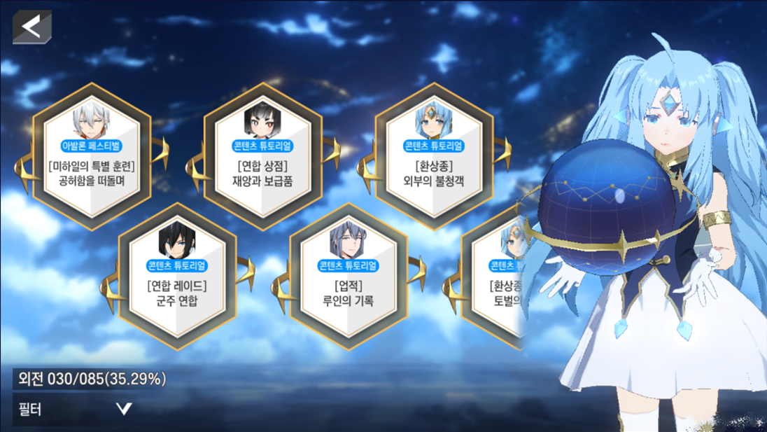 - 외전: 시나리오 외 영웅의 계약, 로얄 패스, 아발론 이벤트 등의 스토리를 감상할 수 있습니다.