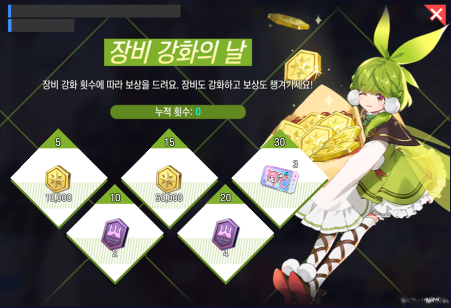 - 매일 장비 강화 횟수에 따라 보상을 드립니다! 장비도 강화하고 보상도 챙겨가세요!