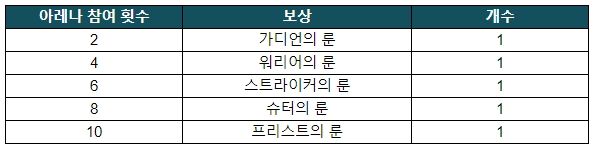 - 이벤트 기간 동안 매일 아레나 도전 공격 횟수만큼 보상을 드립니다!