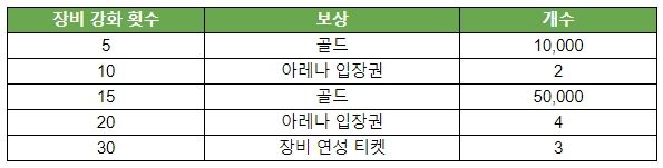 - 매일 장비 강화 횟수에 따라 보상을 드립니다! 장비도 강화하고 보상도 챙겨가세요!