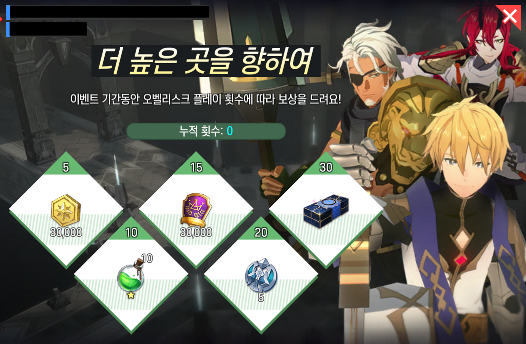 - 이벤트 기간동안 오벨리스크 플레이 횟수에 따라 보상을 드립니다!