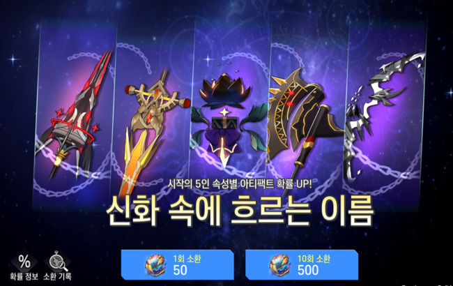 ※ 신화 속에 흐르는 이름의 각 아티팩트 확률은 게임 내 [소환 > 신화 속에 흐르는 이름 > 확률 정보%]에서 확인할 수 있습니다.
