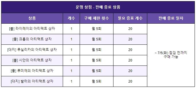 2) 운명 상점 내 판매 중인 상품 6종의 판매가 종료됩니다.