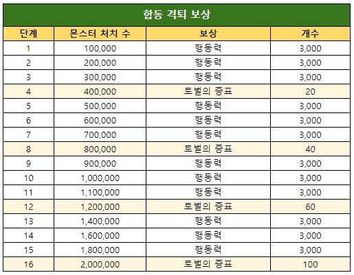 - 페스티벌 종료 시, 미사용한 토벌의 증표는 수량에 비례하여 개당 500 골드로 자동 교환됩니다.