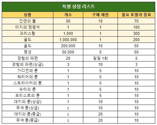 - ‘[묘믹] 토벌의 증표’을 사용하여 ‘특별 상점’에서 다양한 아이템으로 교환할 수 있습니다.