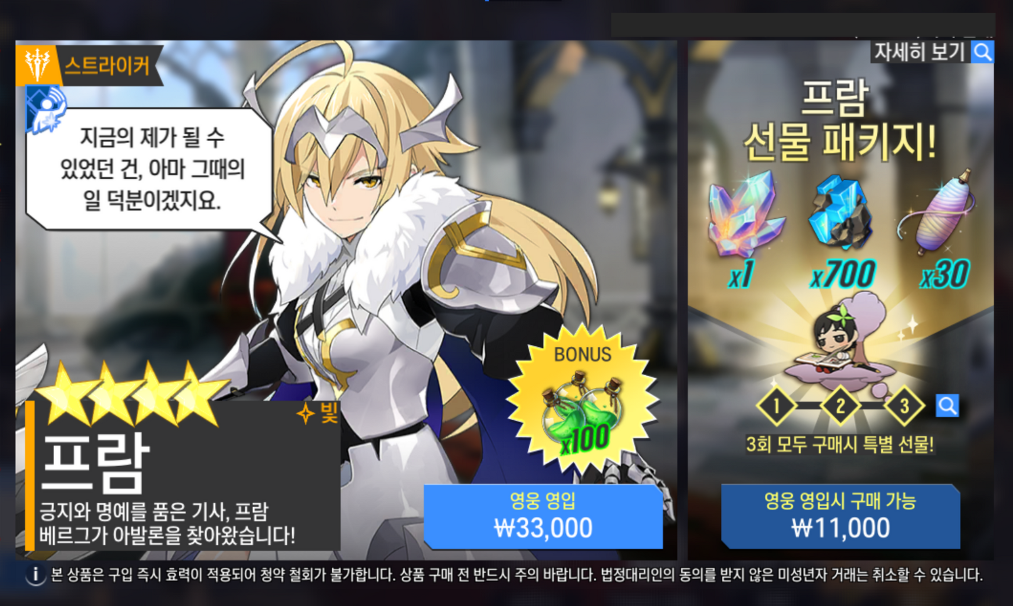 - 신규 영웅 패키지 [빛] 프람 영입 후 구매할 수 있는 상품입니다.