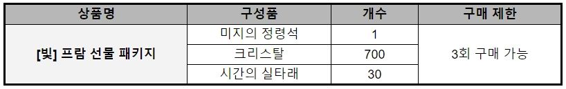 ※ 이미 [빛] 프람을 영입 완료하신 로드님께서는 ‘[빛] 프람을 위한 선물’을 추가 영입 없이 재구매하실 수 있습니다.