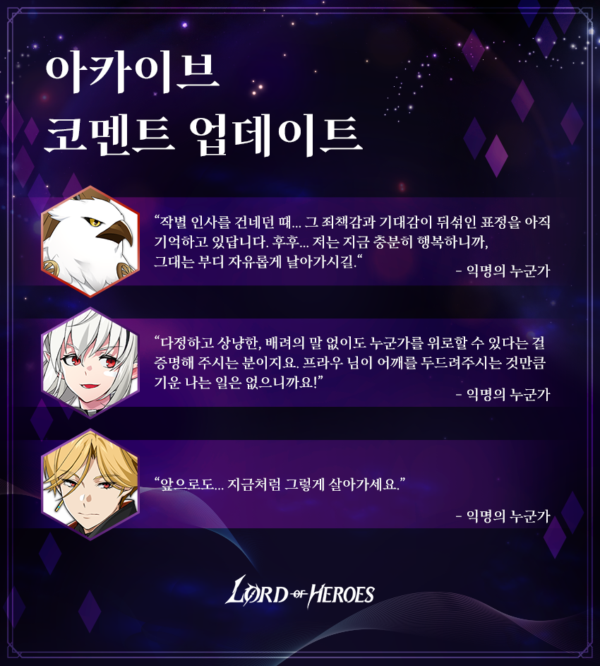 * 영웅 코멘트는 [아카이브 > 영웅] 에서 확인하실 수 있습니다.
