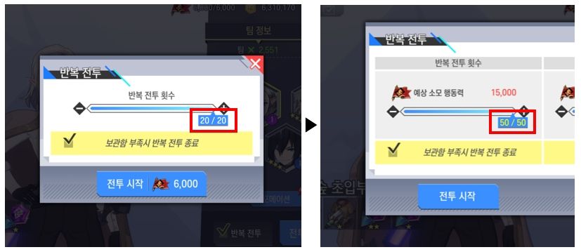 - ‘빠른 전투’는 각 전투 대기 화면에서 [반복 전투] 창에서 진행을 원하는 횟수를 선택한 뒤 [빠른 전투] 버튼을 눌러 진행할 수 있습니다.