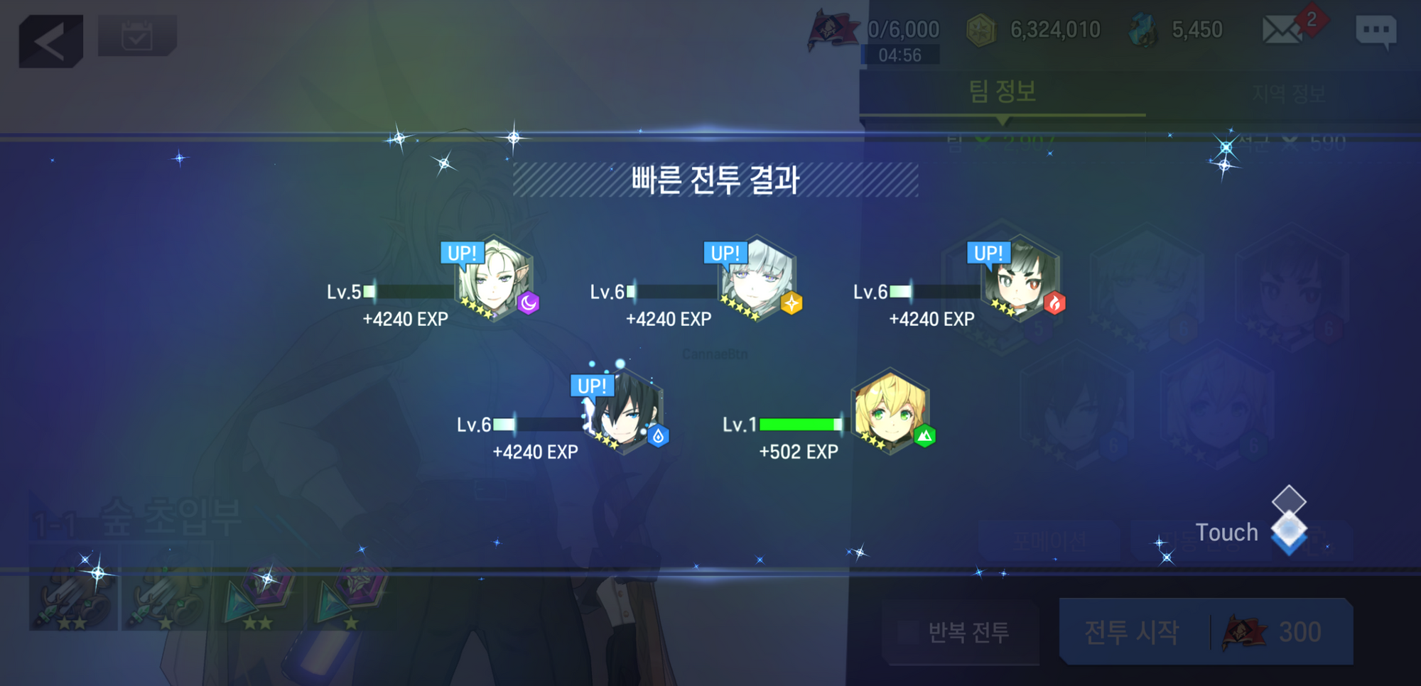 - 빠른 전투 진행 즉시, 경험치를 획득하는 영웅들의 정보와 빠른 전투 결과로 획득된 아이템을 확인할 수 있습니다.
