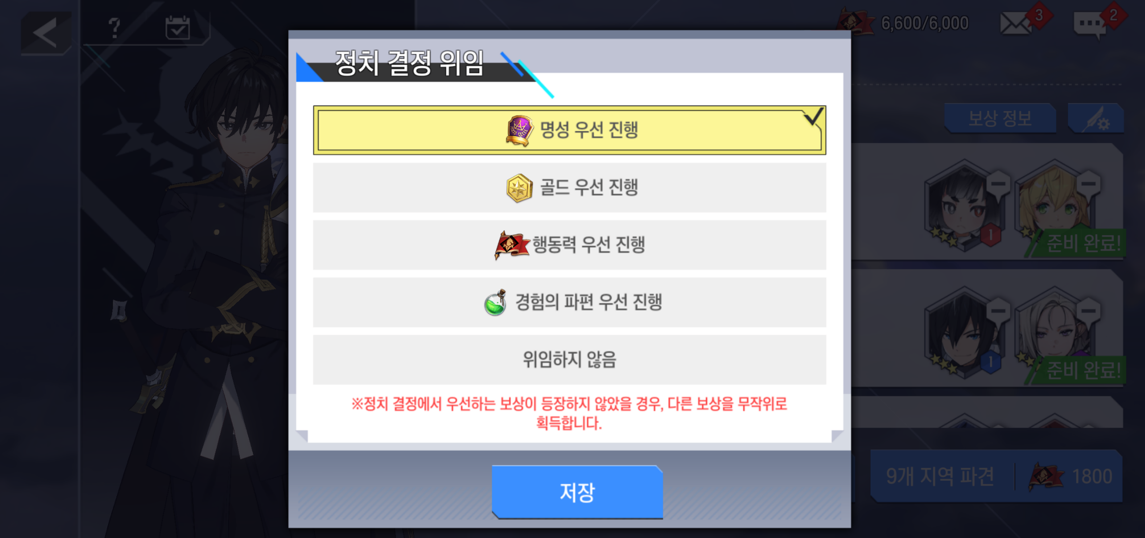 - [파견]에서 우선하는 정치 결정을 미리 선택하여 파견 완료 시 우선하는 선택지의 보상을 우선 수령할 수 있는 [정치 결정 위임] 기능이 추가됩니다.