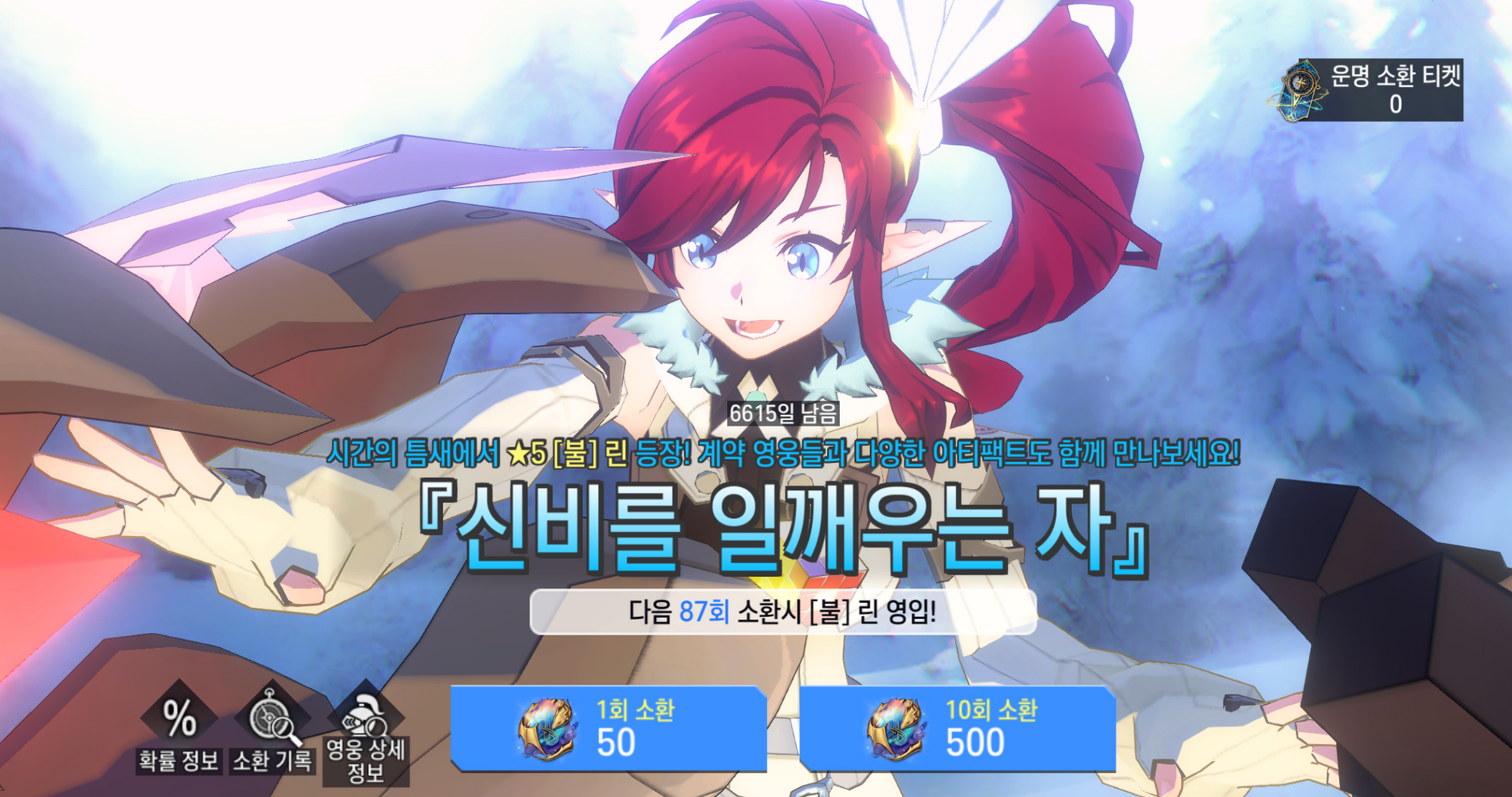 ※ ‘신비를 일깨우는 자’에서 89회 이상 ★5 [불] 린이 등장하지 않을 경우, 90번째 소환에서 ★5 [불] 린을 100% 확률로 소환합니다.