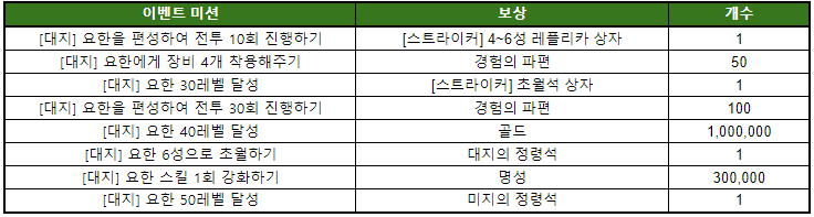 - [대지] 요한은 신규 영웅 패키지 구매로 영입이 가능합니다.