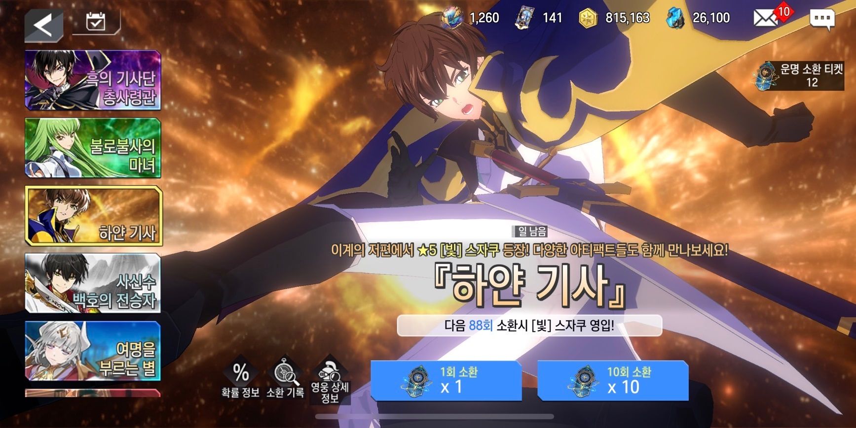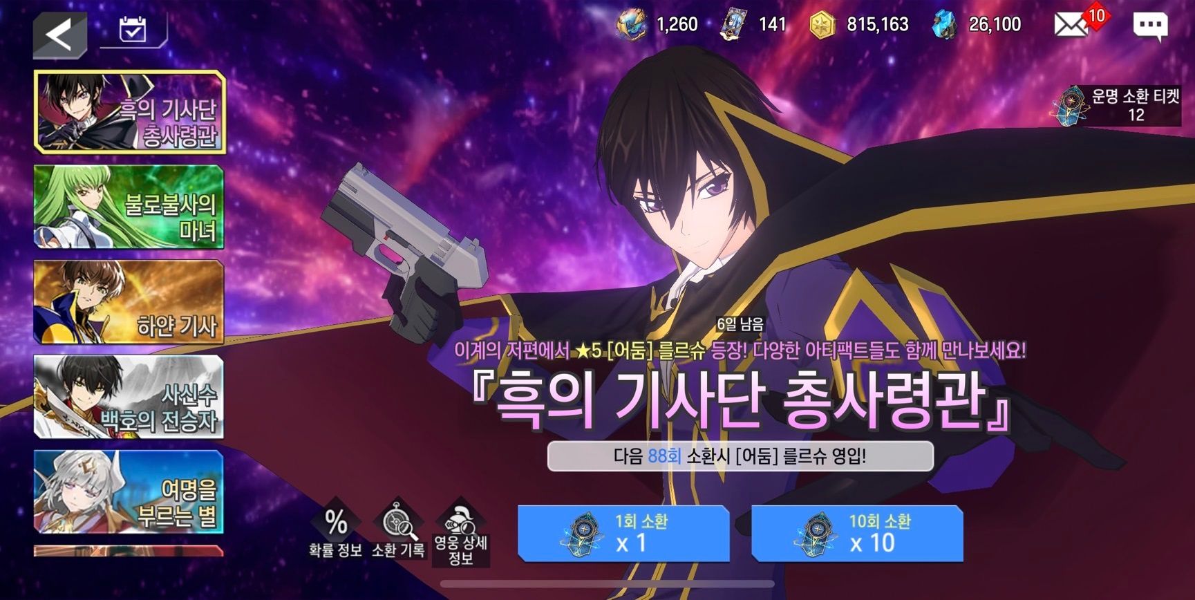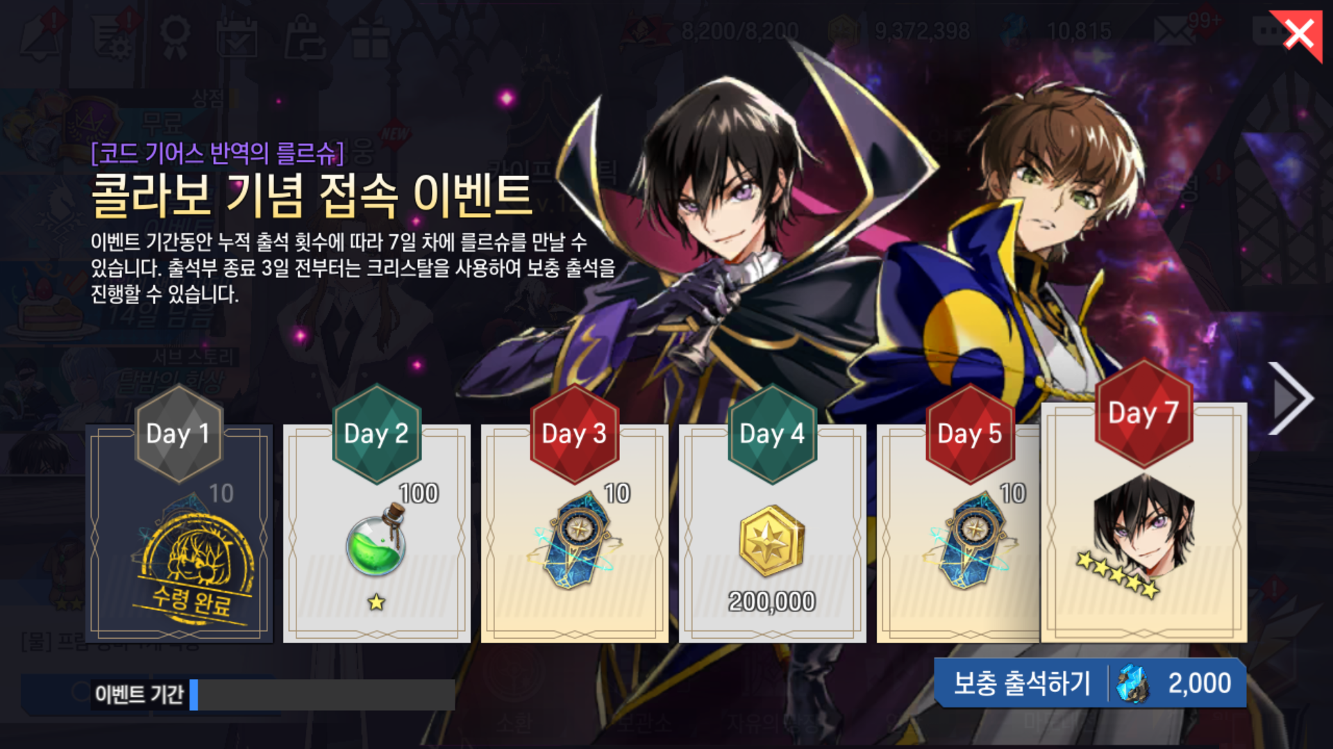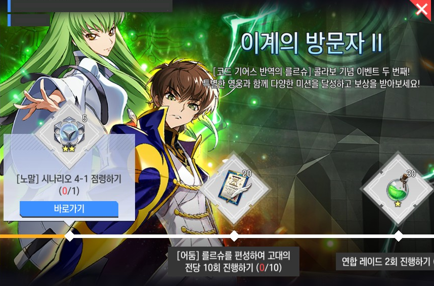 - 코드기어스 반역의 를르슈 콜라보 기념 두 번째 이벤트! 특별한 영웅들과 다양한 미션을 달성하고 보상을 받아 보세요!