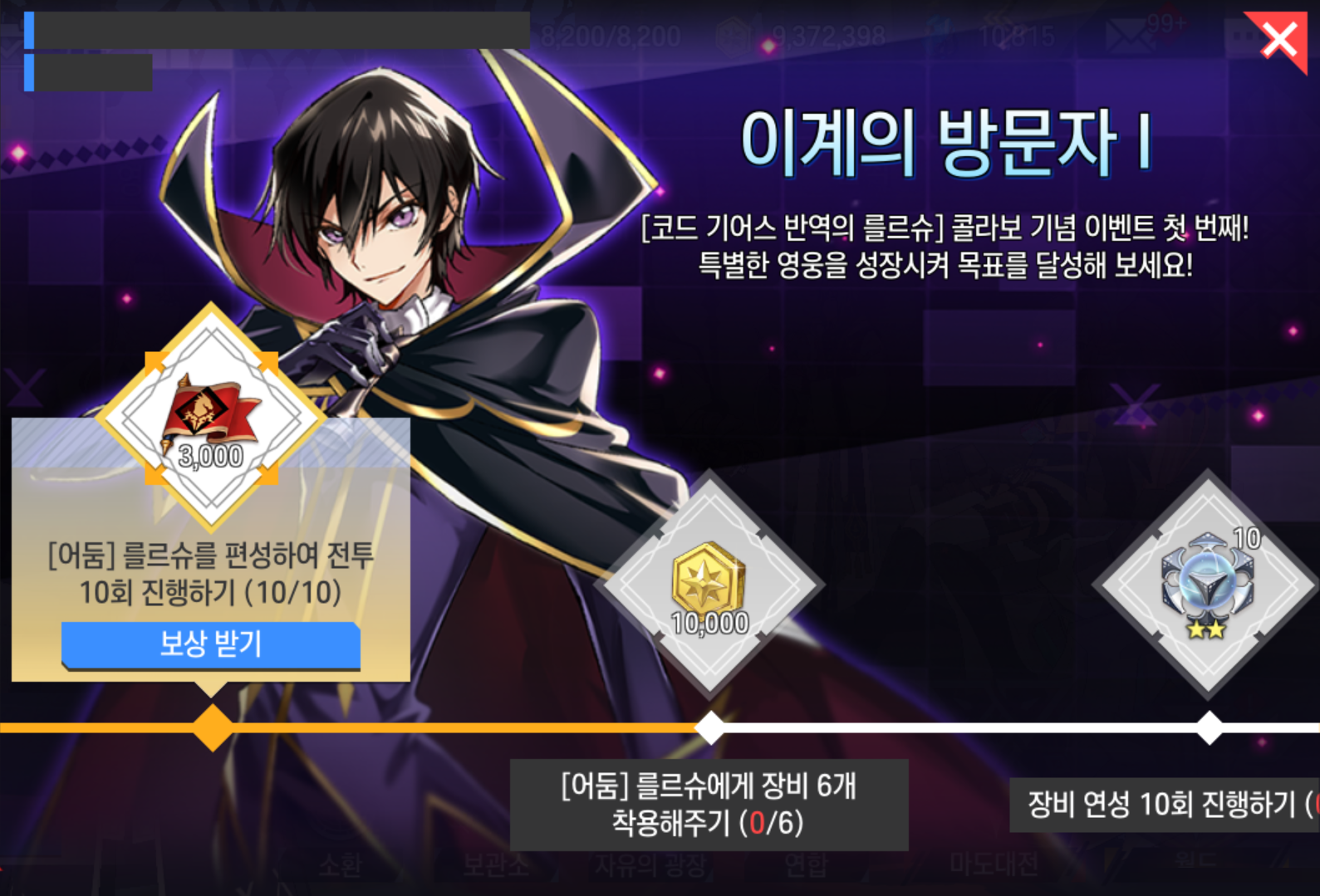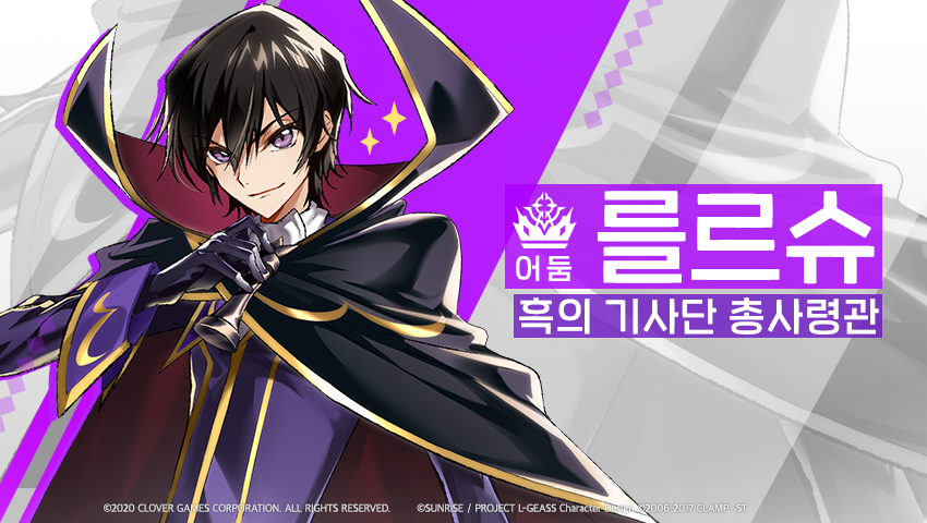 - [어둠] 를르슈는 [코드 기어스 반역의 를르슈] 콜라보기념 접속 이벤트 출석부를 통해 영입이 가능합니다.
