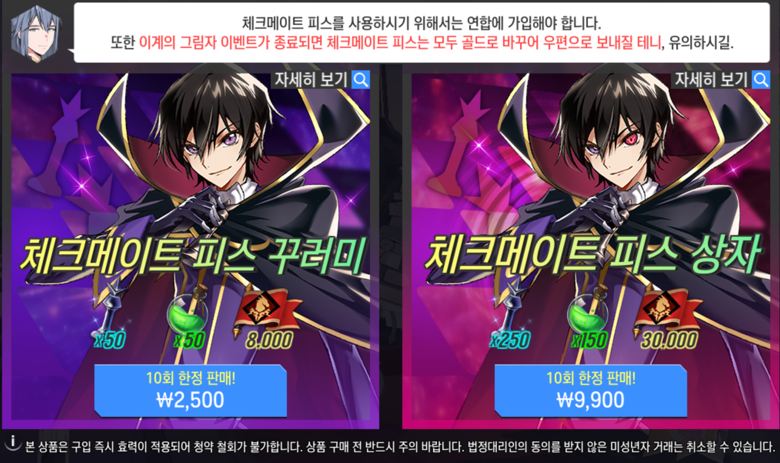 ※ 이계의 그림자 이벤트가 종료되면 체크메이트 피스는 모두 골드로 변경되어 우편으로 지급됩니다.