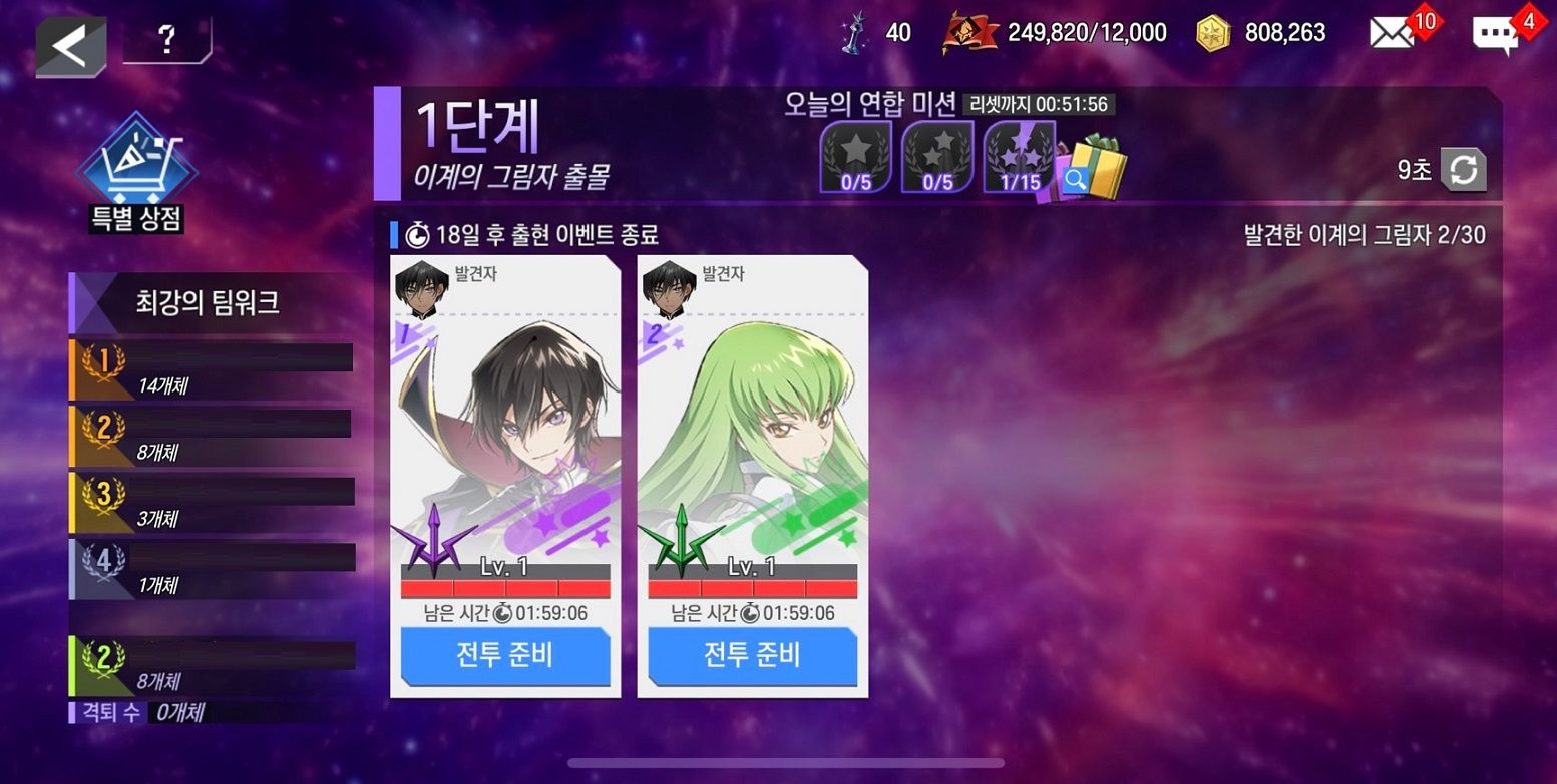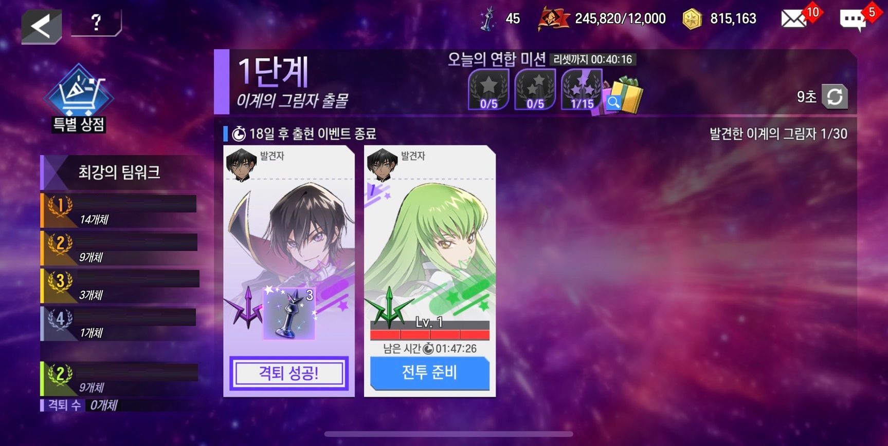 - 코드기어스 반역의 를르슈 콜라보 기념 첫 번째 이벤트! 특별한 영웅들을 성장시켜 목표를 달성해 보세요!