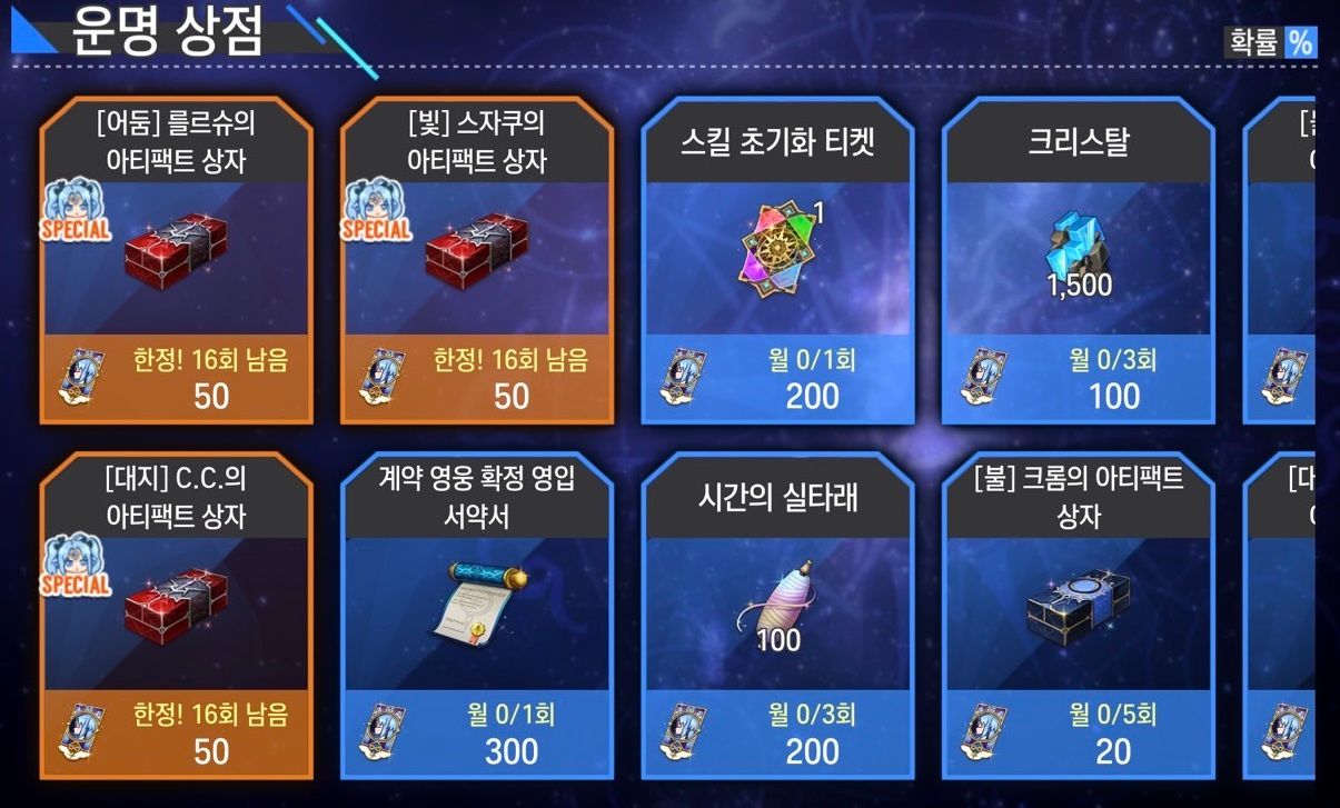 - 신규 추가 상품 : [어둠] 를르슈의 아티팩트 상자, [대지] C.C.의 아티팩트 상자, [빛] 스자쿠의 아티팩트 상자