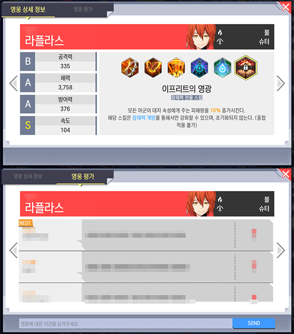그동안은 영웅에 대한 다른 로드님들의 의견을 볼 수 있는 경로가 ‘유니버스’ 뿐이라 접근성이 조금 부족했었다고 생각합니다. 그러한 부분을 개선하여, 이제 소환 메뉴의 영웅 상세 정보 화면에서 영웅 평가 게시판도 함께 보실 수 있습니다.