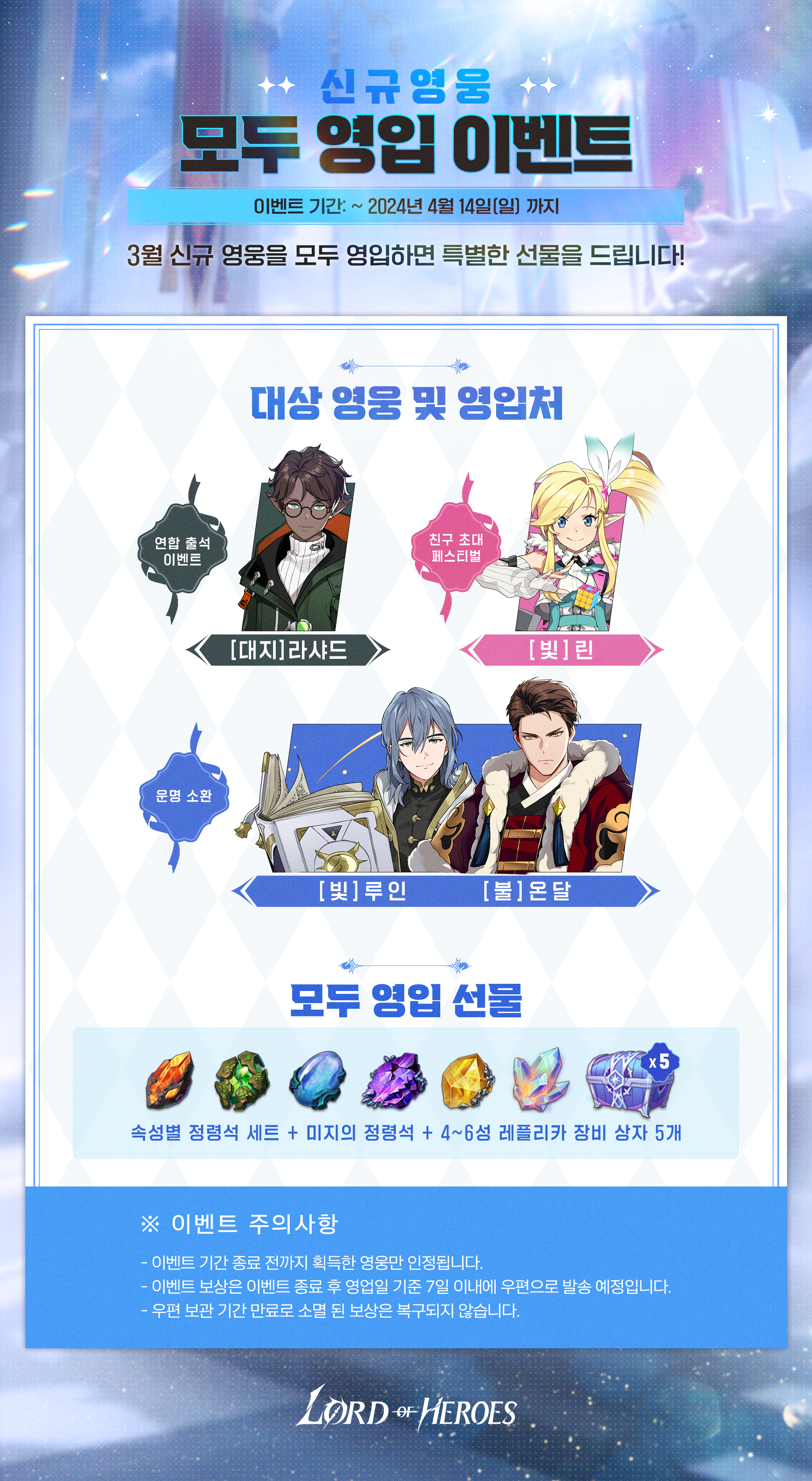 이벤트 [이벤트] [보상 지급 완료] 신규 영웅 모두 영입 이벤트! GM 플로렌스 Read more posts by this author. GM 플로렌스 2024년 3월 21일 목요일 ■ 4월 16일 18시에 이벤트 보상 지급이 완료되었습니다.■ 4월 17일 10시 30분경 누락되었던 보상이 추가 지급되었습니다.▶ 연합 출석 이벤트 & 친구 초대 페스티벌 알아보기 | [대지] 라샤드 & [빛] 린