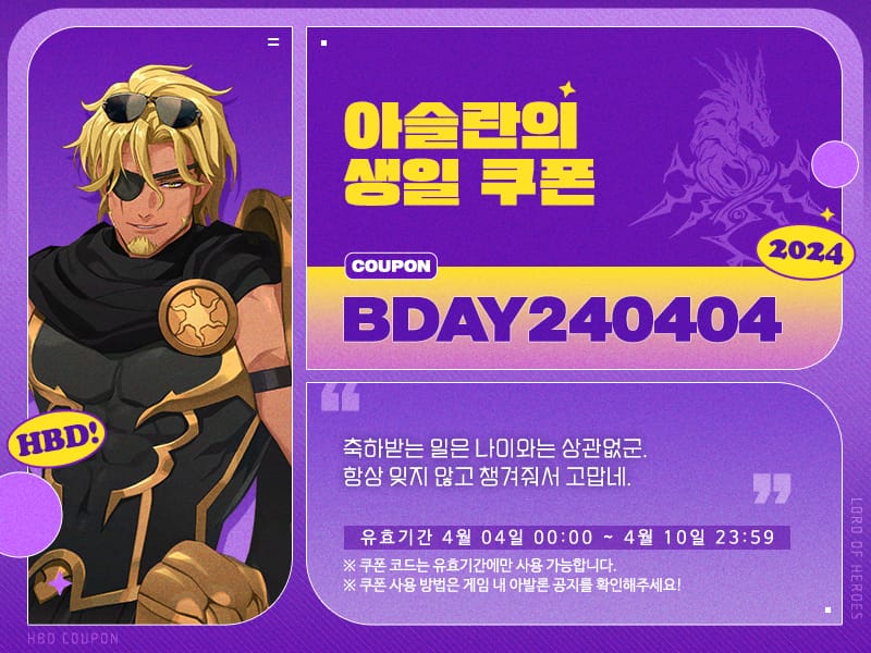 로드, 4월 4일은 아슬란의 생일입니다!