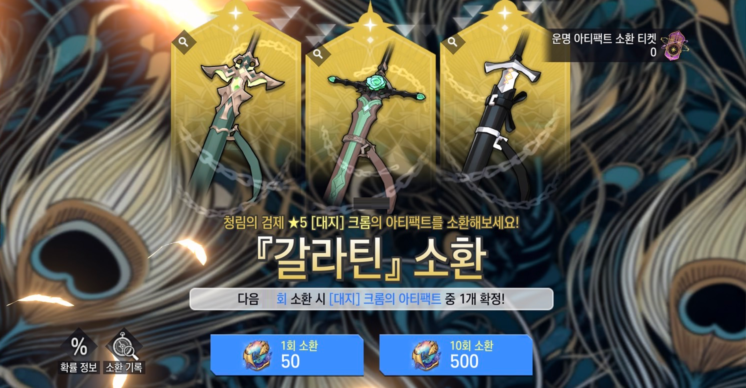 ※ 게임 내 소환 페이지에 있는 [확률 정보] 버튼을 통해 상세 확률 정보 및 소환으로 획득 가능한 아티팩트 목록을 확인할 수 있습니다.