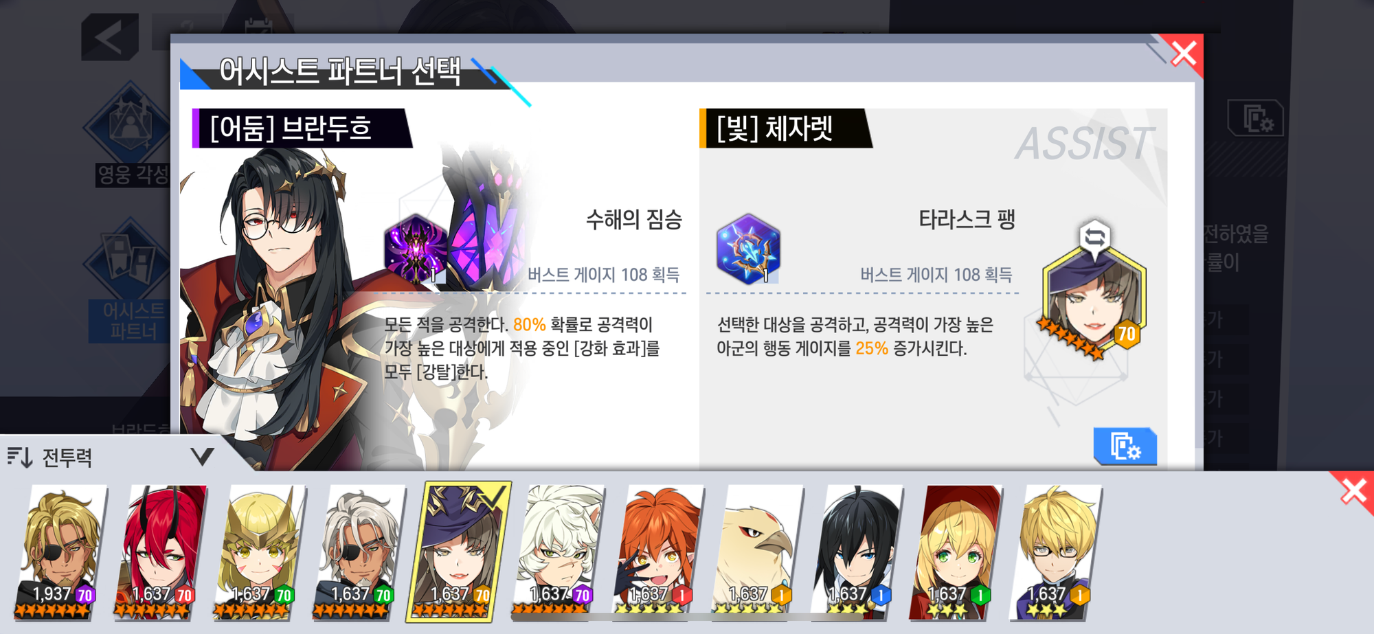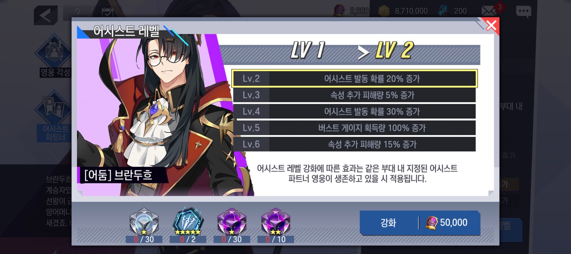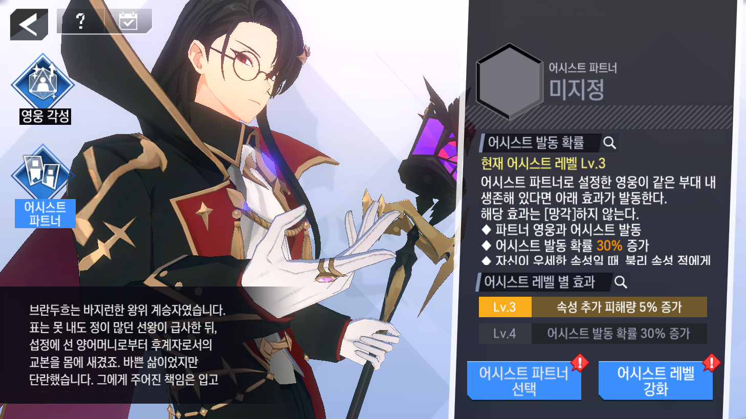 - 어시스트 레벨이 강화되어 있으나 [어시스트 파트너]가 지정되어 있지 않은 경우, 해당 영웅의 어시스트 발동 확률은 기본값으로 적용