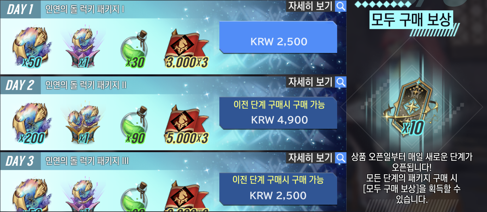 ※ 단계별 패키지를 모두 구매할 경우, ‘인연 소환 티켓 10장’을 획득할 수 있습니다.