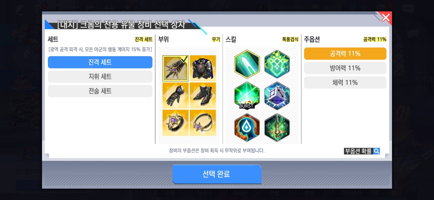 ※ 장비의 세트, 부위, 주옵션, 전용 스킬을 선택하여 획득할 수 있으며, 부옵션은 장비 획득 시 무작위로 부여됩니다.