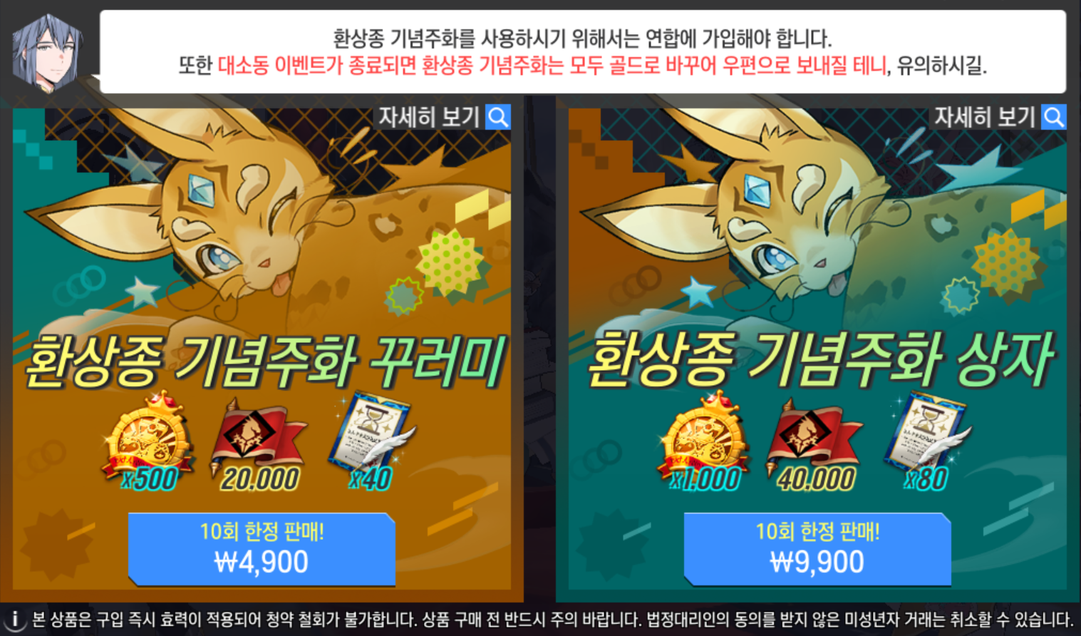 ※ 환상종 대소동 이벤트 종료 시 미사용한 환상종 기념주화는 수량에 비례하여 골드로 교환됩니다.