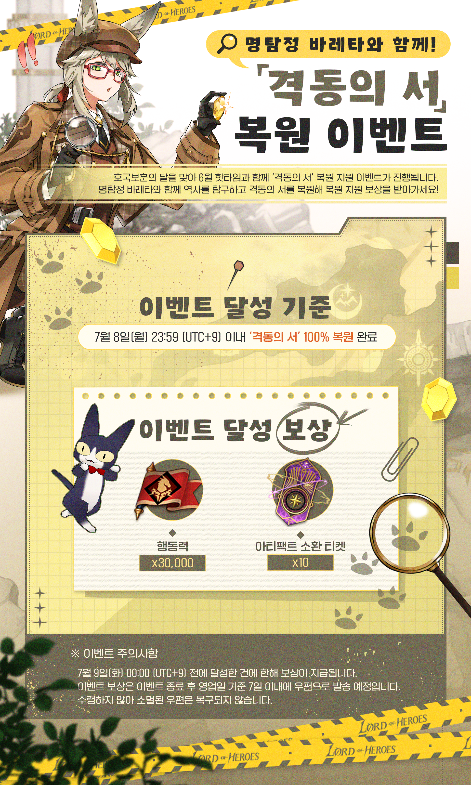 이벤트 [이벤트] [보상 지급 완료] 명탐정 바레타와 함께! ‘격동의 서’ 복원! GM 플로렌스 Read more posts by this author. GM 플로렌스 2024년 6월 3일 월요일 ■ 7월 9일 12시에 이벤트 보상 지급이 완료되었습니다.