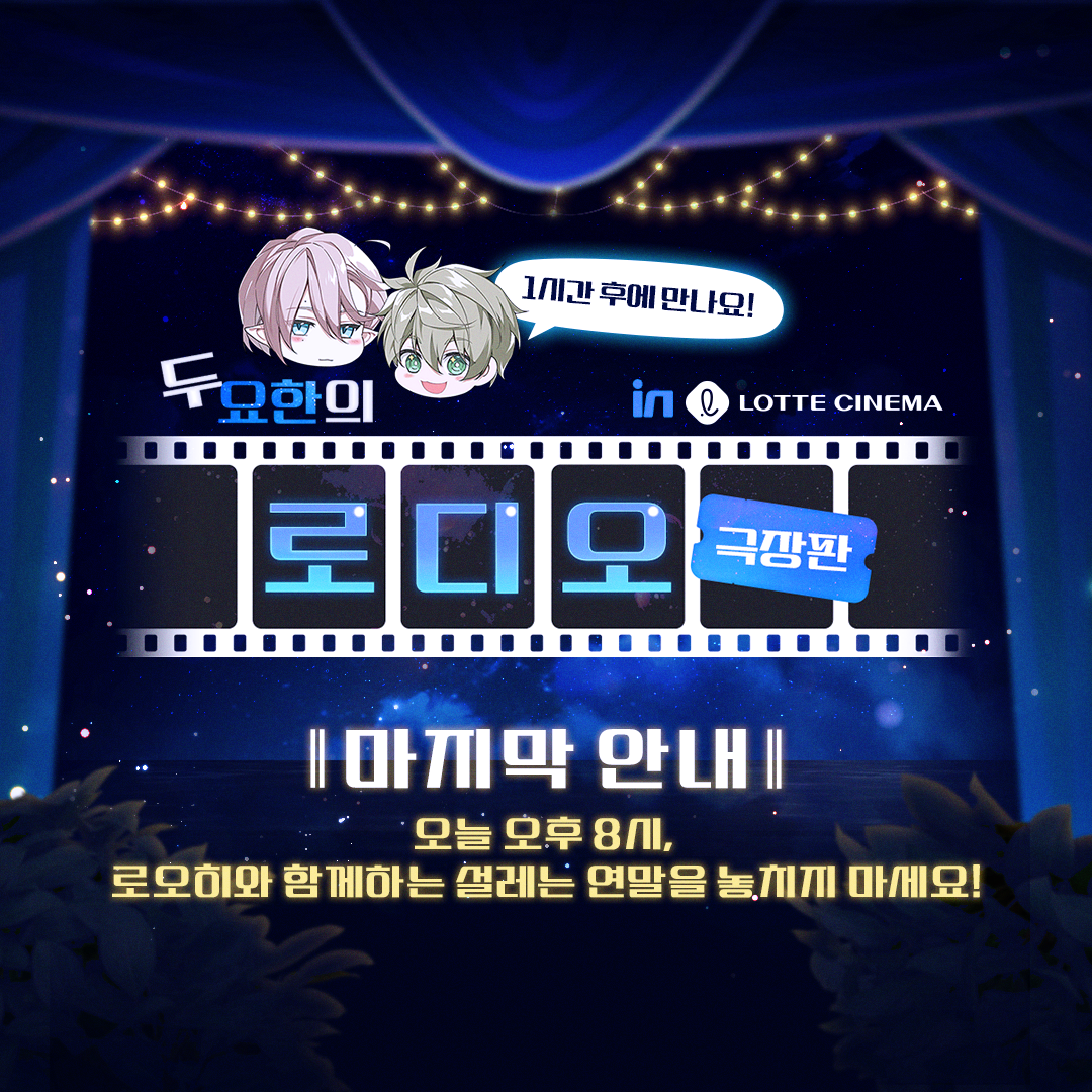 공지사항 [두 요한의 로디오 극장판] 1시간 후에 만나요! GM 문레이크 Read more posts by this author. GM 문레이크 2024년 12월 13일 금요일 극장판으로 돌아온 연말 특집 방송,[두 요한의 로디오 극장판] 시작까지 1시간밖에 남지 않았어요!롯데시네마에서 로드님들과 함께하는 스페셜한 연말😎오늘 오후 8시, 로디오에서 만나요~▶ [두 요한의 로디오 극장판] 보러가기