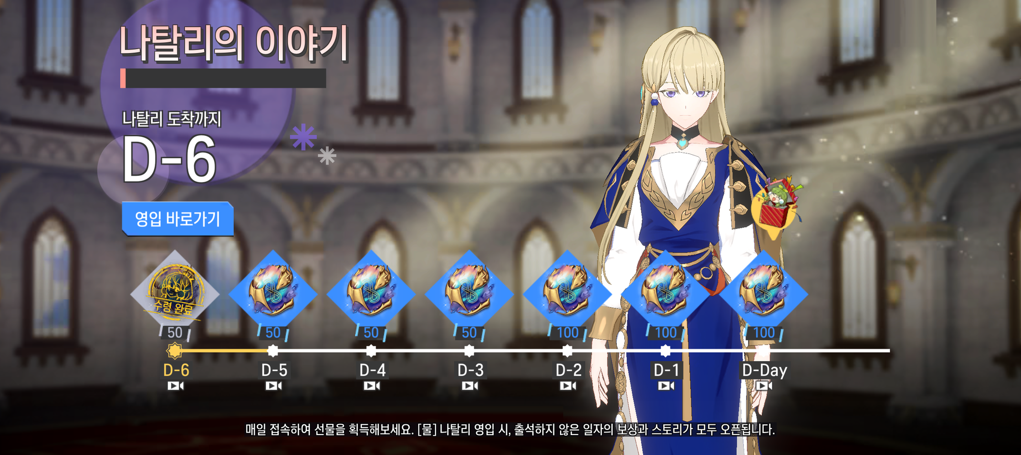 ※ 카운트 다운 출석부 종료 후에는 나탈리를 영입해도 스토리가 오픈되지 않습니다.