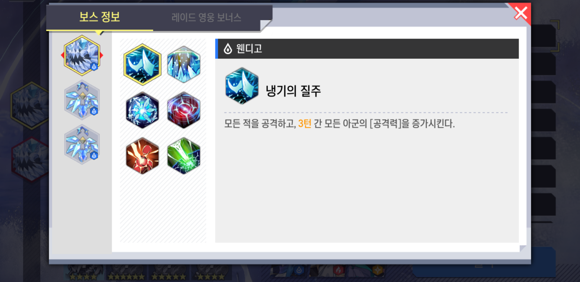 - 좌측 중앙에 위치한 돋보기 UI를 터치하면 출현하는 적들의 정보와 보너스 영웅을 확인할 수 있습니다.