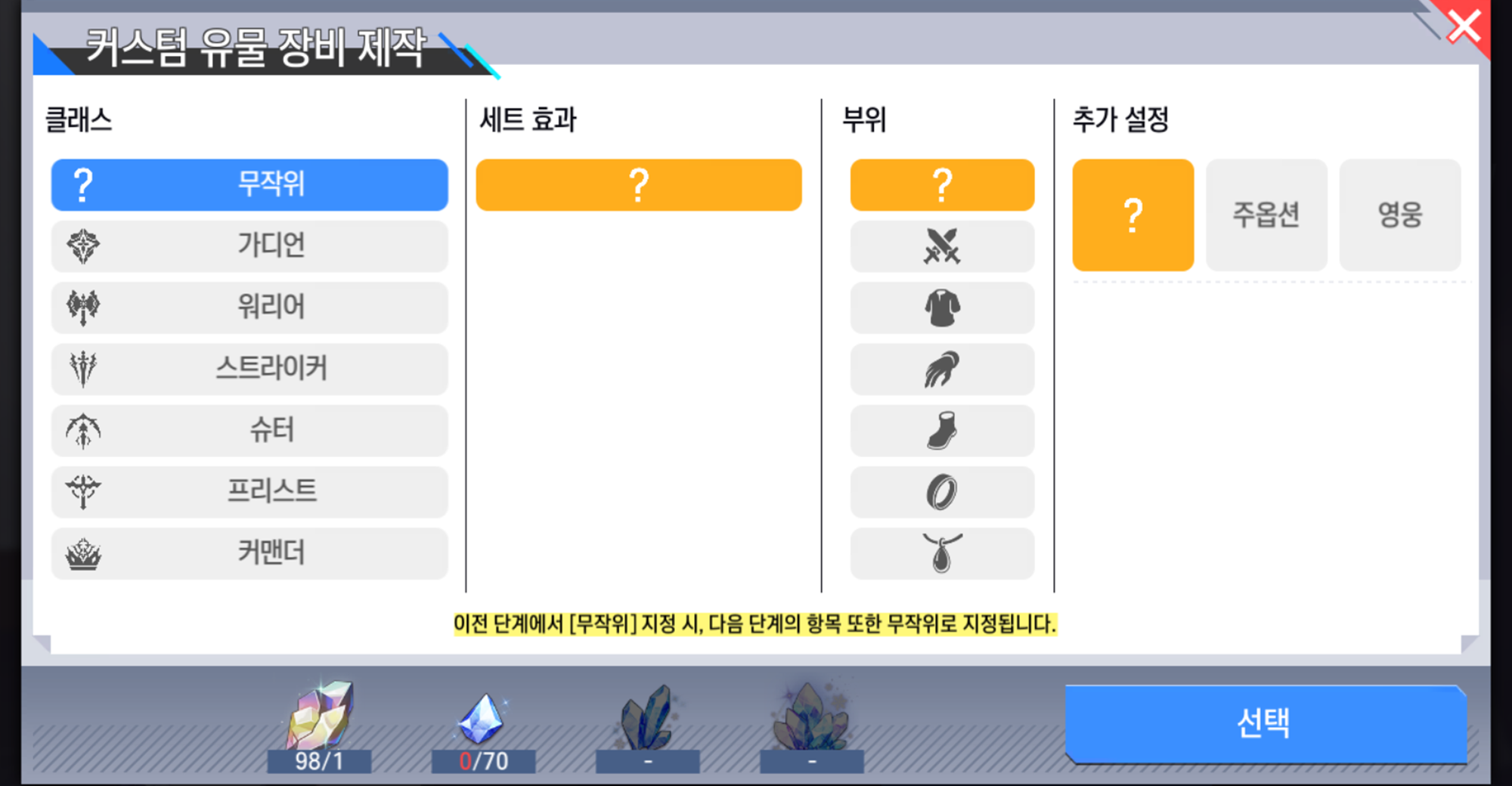 예시) 클래스 선택 단계에서 [무작위] 옵션을 선택할 경우 다음 단계의 커스텀 옵션들이(세트,부위,주옵션,영웅) 모두 무작위로 지정됩니다.