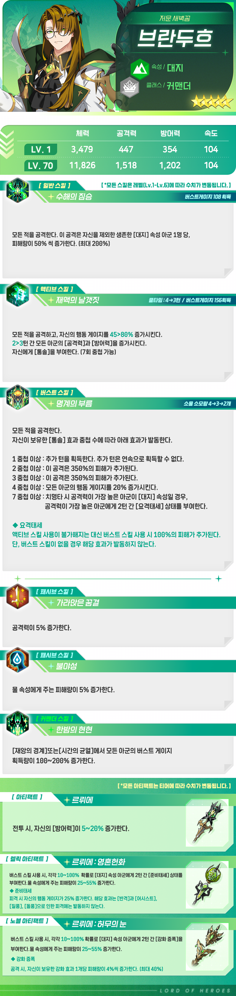 태어난 순간부터 왕국의 계승자였던 브란두흐는 쉴 틈 없이 움직여야만 했습니다. 올바른 길을 찾고 이끄는 것. 군주로서의 사명. 각 분야에 통달하기 위해 이론 공부도 게을리할 수 없었고, 그의 양어머니이자 스승인 대마도사 릴리안의 영향으로 경지를 넘어선 마법을 깨우치기도 했죠. 가장 놀라운 건 이 모든 걸 빈틈없이 해내는 동안에도 불평 한번 하지 않았다는 겁니다. 타고난 그릇의 크기와 온화한 성품은 브란두흐를 완벽한 왕의 재목으로 만들었지요. 그뿐일까요? 브란두흐는 매일 세상에, 그보다는 이 우주의 섭리에 감사했습니다. 지켜 마땅한 이들을 지탱하게 되었으니, 어찌 기쁘지 않을까요?
